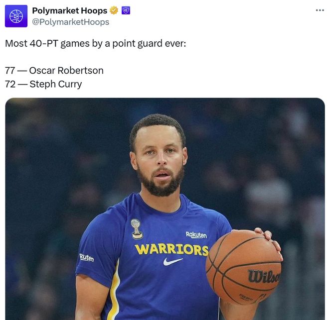 如果进一步将范围缩小到控卫,库里72次40+得分表现位列历史第二,仅次于奥斯卡-罗伯特森(77次)。