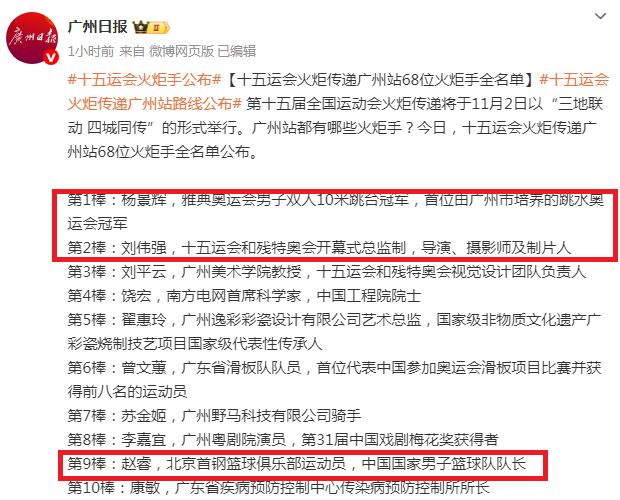 北京时间10月31日,根据《广州日报》报道,第15届全运会火炬传递广州站的68位火炬手名单全部出炉,中国男篮队长、广东全运男篮球员赵睿入选,他成为广州站第9棒火炬手,而第一棒火炬手是雅典奥运会冠军杨景辉。