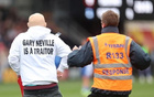 两男子穿着印有“加里-内维尔是叛徒”的衣服,冲入英乙赛场